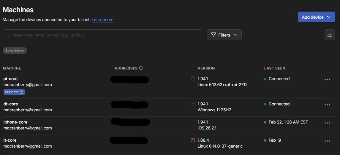 Tailscale creates a WireGuard-based mesh VPN across all my devices. Whether I am across town or internationally, I can securely access my home network, NAS files, and Home Assistant - no port forwarding and no exposed ports.